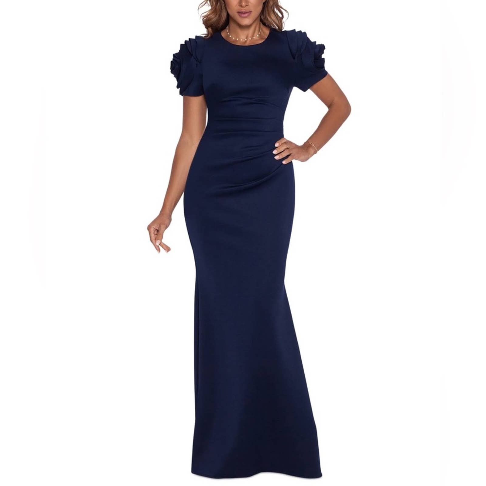 Attend your next special event in style with XSCAPE's fit & flare gown, beautifully adorned with floral-detailed puff sleeves.